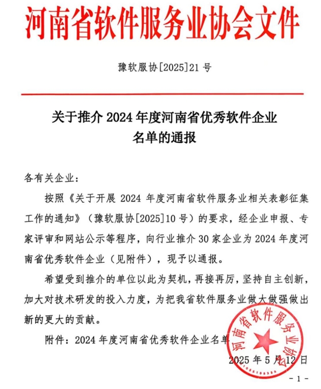 公司再度榮獲 2024 年(nián)河(hé)南(nán)省優秀軟件(jiàn)企業(yè)及産品榮譽